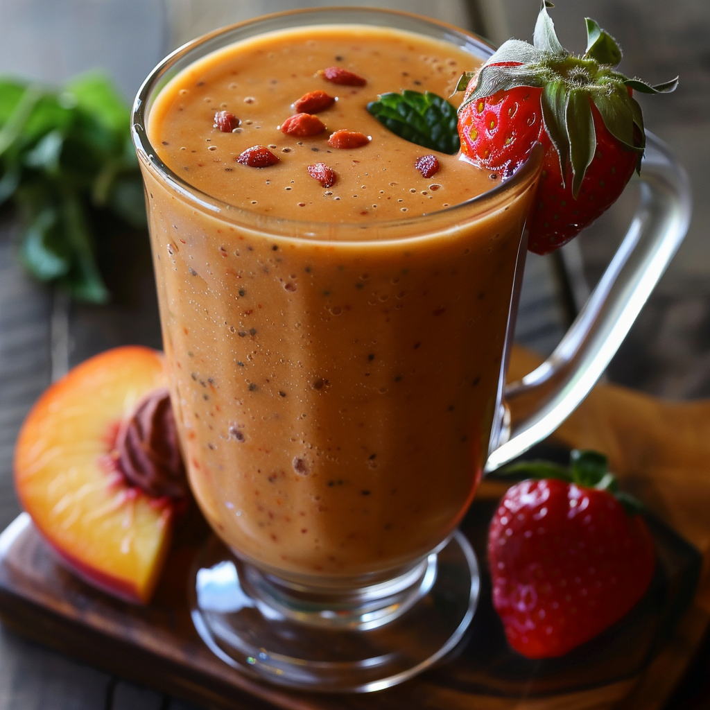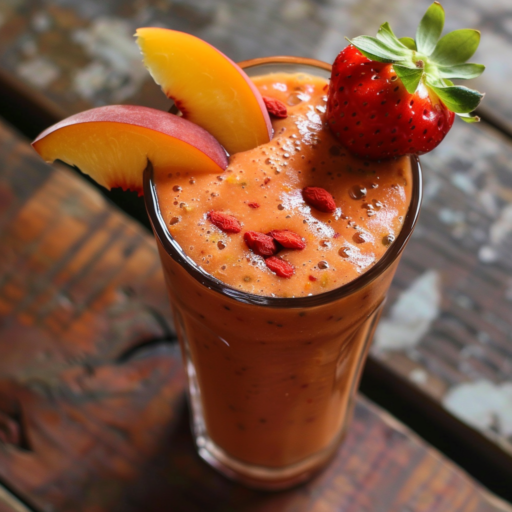 The Goji Berry Glow Smoothie is your go-to drink for a vibrant, energy-packed day. Combining the power of nutrient-dense goji berries with sweet strawberries and juicy sliced peaches, this smoothie is more than just a refreshing treat—it’s a wellness powerhouse.