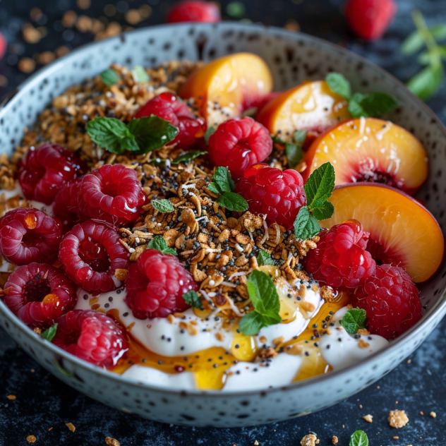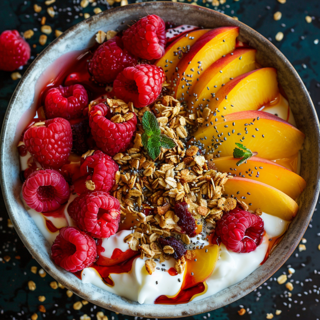 Indulge in Peachy Keen Fruit Salads, a refreshing mix of peaches, raspberries, and granola drizzled with vanilla yogurt—your perfect blend of flavour and nutrition.