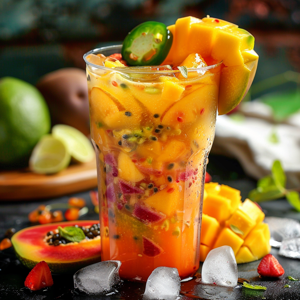 Get ready to tantalize your taste buds with our Spicy Mango Mambo Smoothie, a perfect fusion of sweet, tropical flavors and a spicy kick. This smoothie is crafted with the goodness of ripe mangoes, juicy papaya, and a slice of jalapeño for a delightful heat that awakens your senses. A splash of fresh lime juice and ice brings a zesty, refreshing balance to this bold blend, making it the ideal beverage for adventurous flavor seekers.