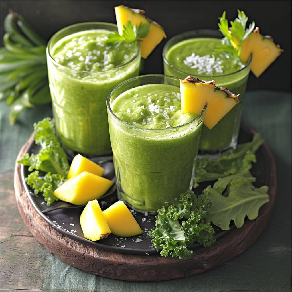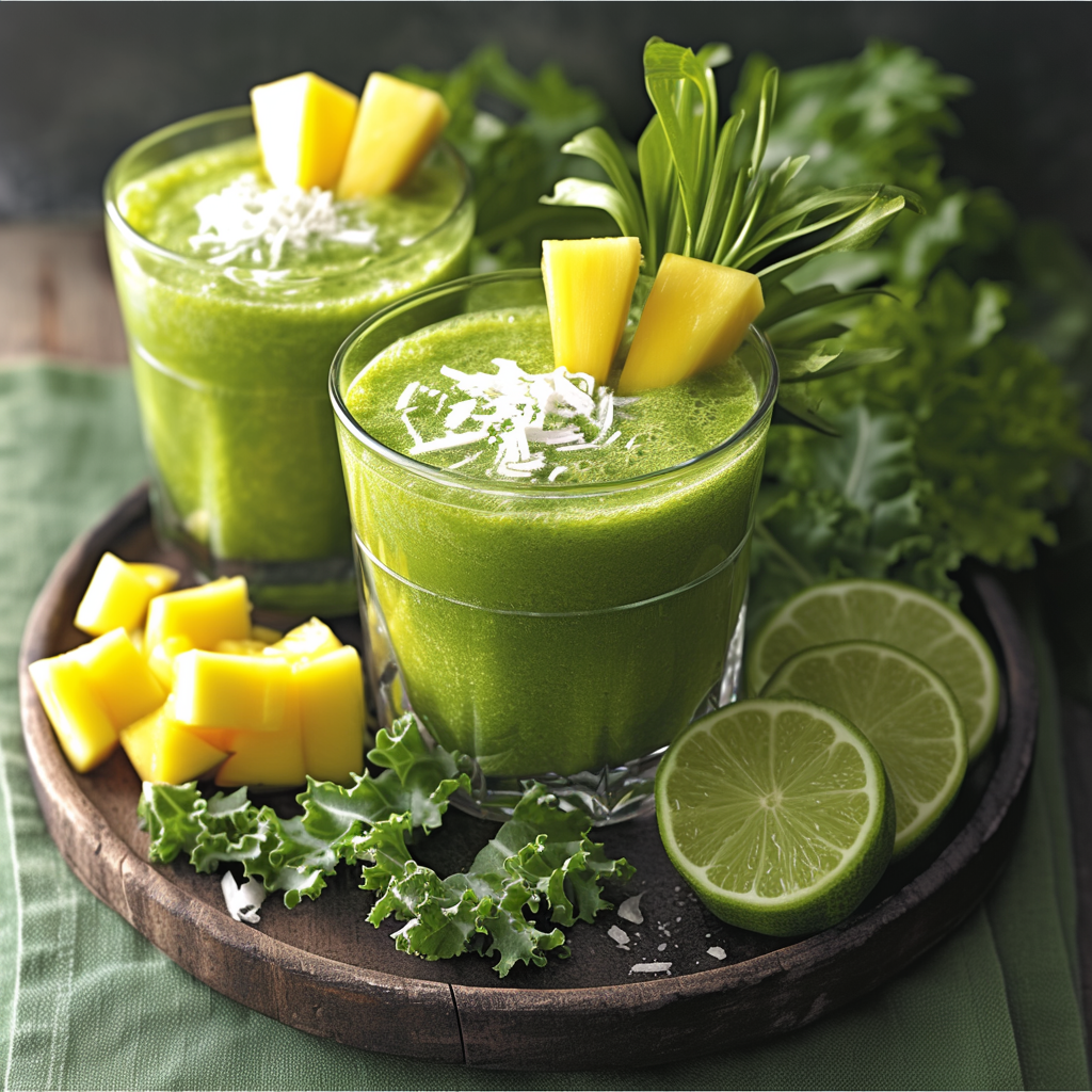 Our Smoothie features a vibrant combination of juicy mango chunks, sweet pineapple pieces, and creamy bananas. These tropical fruits come together to create a smooth, delicious base. To top it off, a few leaves of kale or spinach are added for a nutritious green twist, making this smoothie both flavorful and healthy.